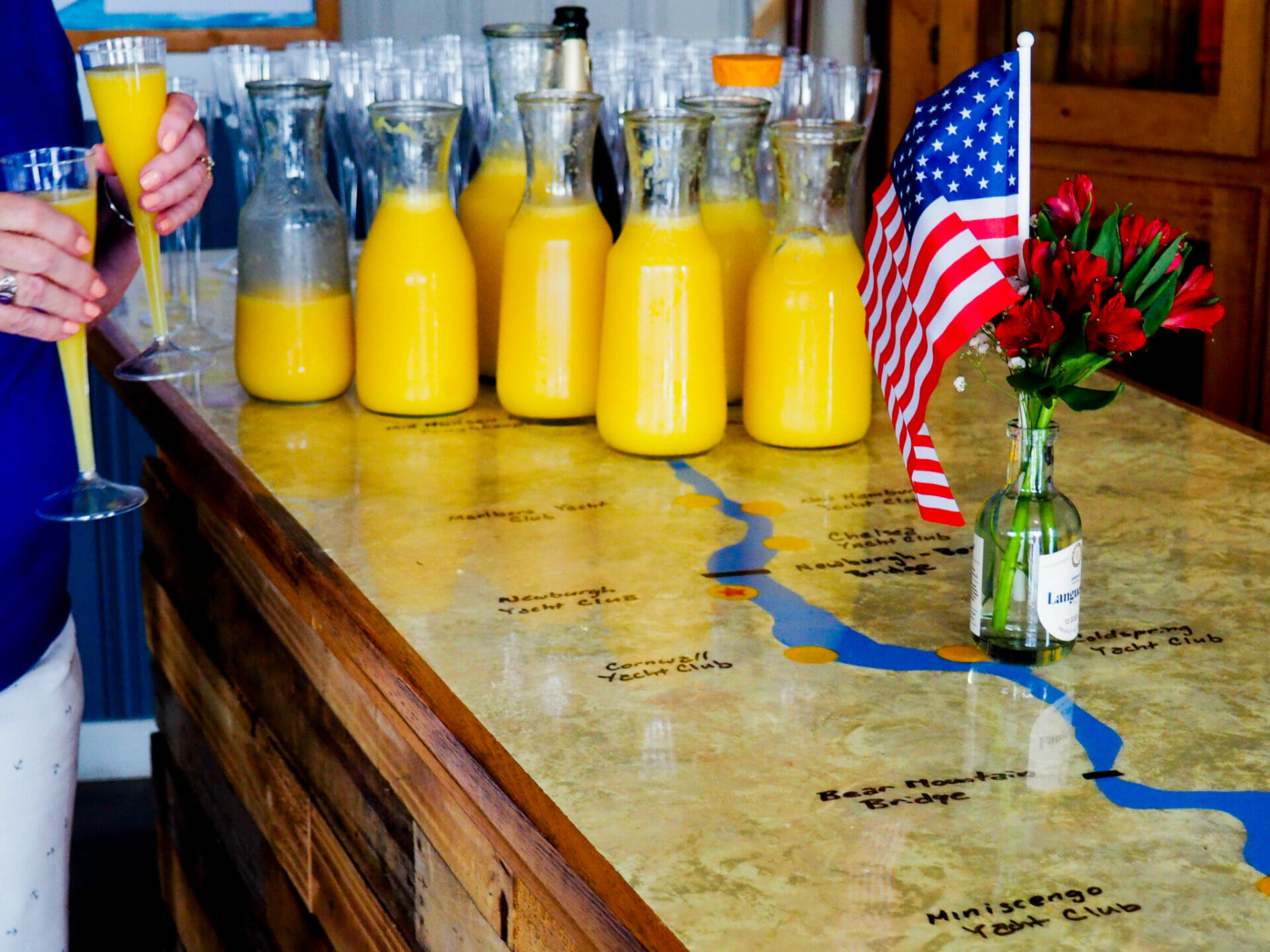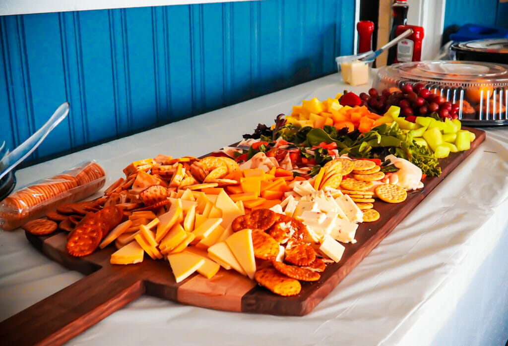 A delicious brunch is served in the clubhouse, featuring fruits, cheeses, eggs, french toast, bacon, sausage, potatoes, baked goods, juices, and more. Adults can enjoy Champagne and Orange Juice Mimosas.